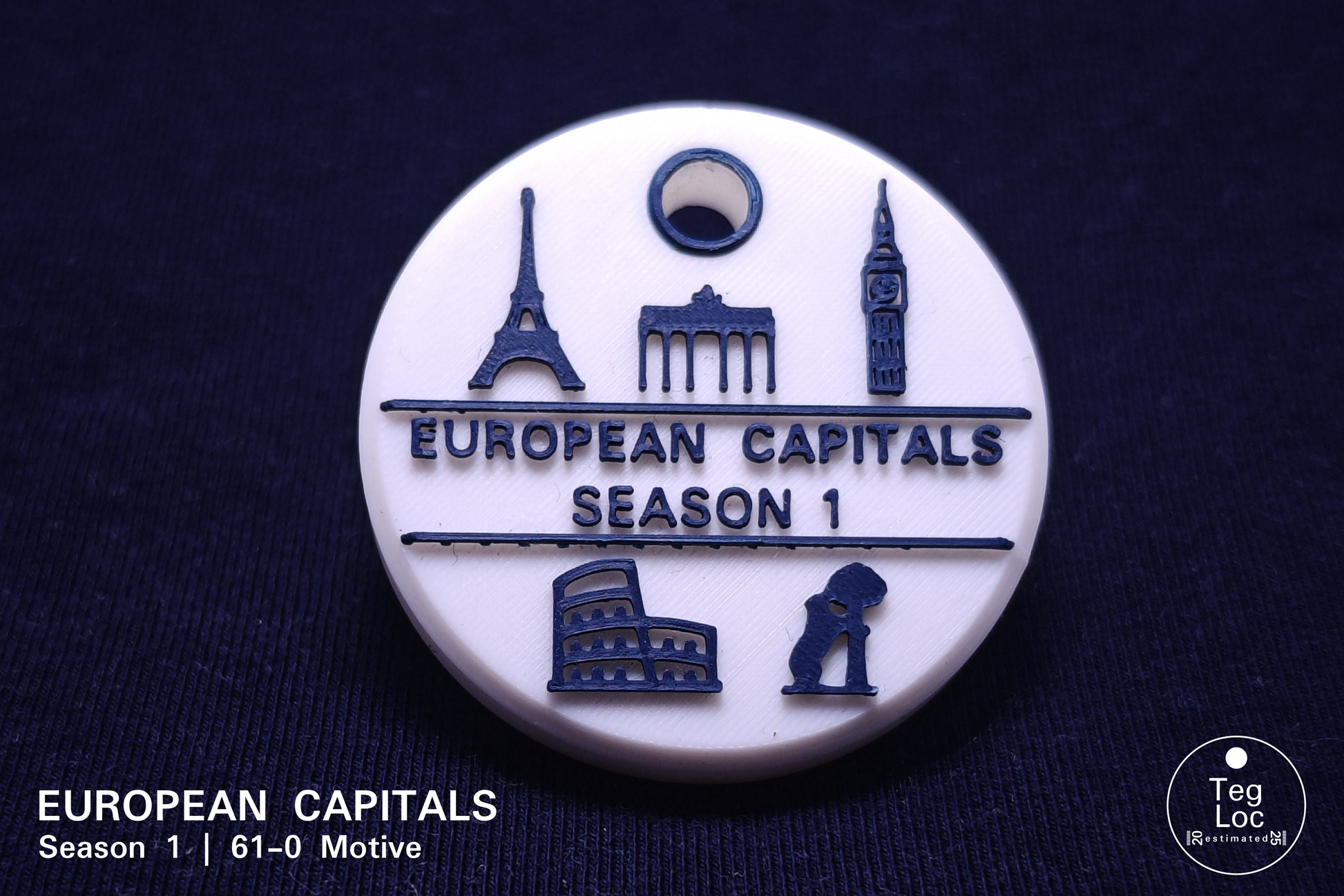 TEG-Anhänger #61-0 Serienmotiv mit fünf Hauptstadt-Symbolen mit einem stilisierten Brandenburger Tor (Berlin), Eiffelturm (Paris), Kolosseum (Rom), Big Ben (London) Bär am Apfelbaum (Madrid) und hohem Wiedererkennungswert aus der ersten Sammelreihe: European Capitals – Season 1!